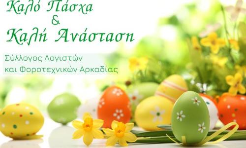 Το διοικητικό συμβούλιο κι ο πρόεδρος του Συλλόγου Λογιστών και Φοροτεχνικών νομού Αρκαδίας εύχονται σε όλους Καλό Πάσχα και Καλή Ανάσταση. Το Άγιο Φως να φωτίσει τις ψυχές και τις καρδιές όλων, δίνοντάς μας υγεία κι ελπίδα, Το ξεκάθαρο μήνυμα της Ανάστασης, ότι ακόμα και τα δεσμά του θανάτου λύονται, |